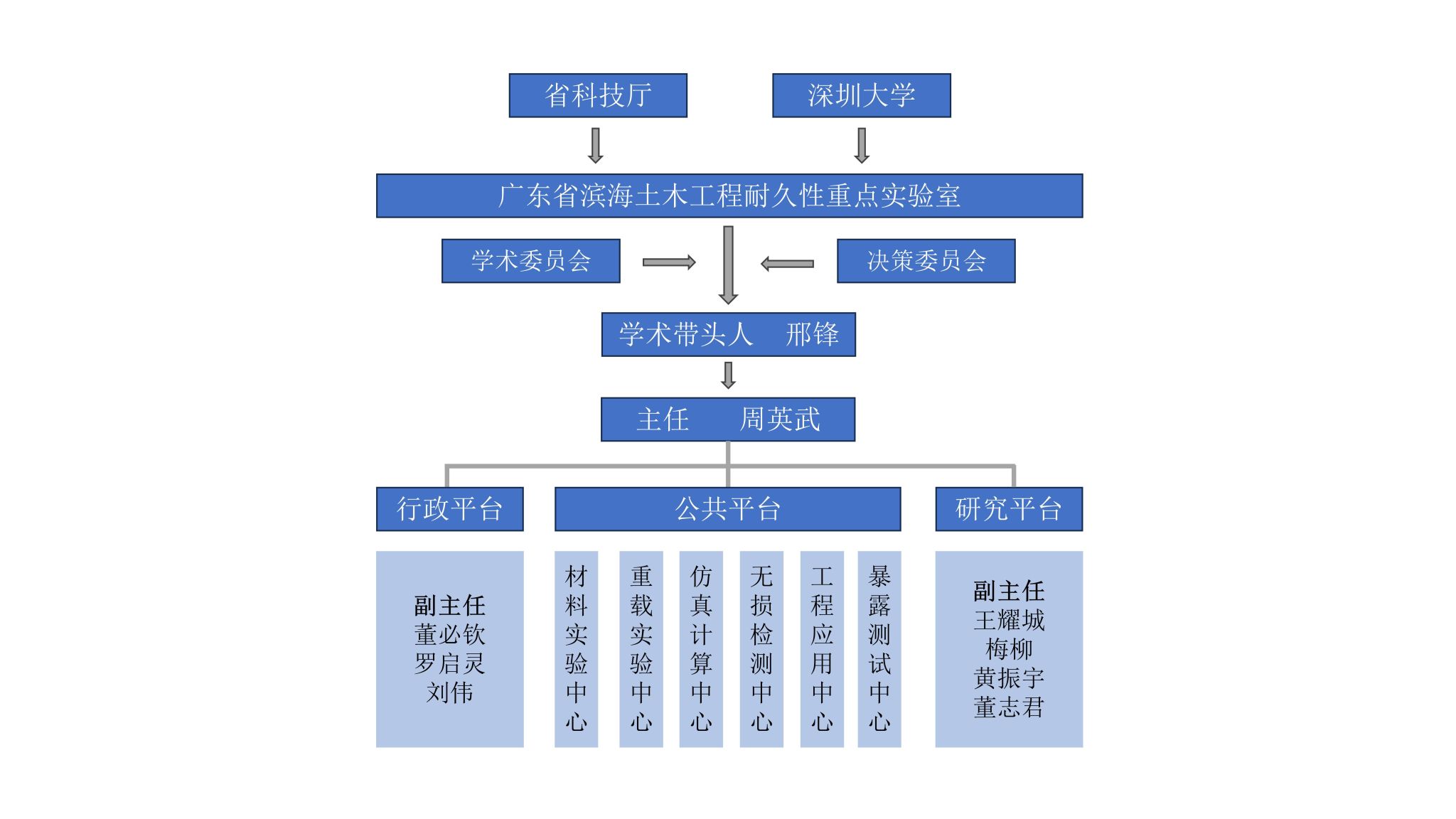 重点实验室的管理机构为3年一届。设立学术委员会(本届主任委员周福霖院士),每年召开一次学术委员会会议,审议和咨询重大研究战略和学术问题。实验室决策委员会(本届由邢锋教授任主任;龙武剑教授和李伟文教授任副主任)负责审定实验室的规章制度、人事、财务及科研方面的重大事项。实验室实行学术委员会和决策委员会领导下的主任负责制(本届实验室主任李大望教授,武汉工业大学博士),配备一名常务副主任(周英武教授,大连理工大学博士)总体管理并组织实施实验室科研工作及行政事务。实验室下设三个平台:研究平台(不同研究团队)和公共平台(5个公共服务中心)由实验室副主任董必钦负责重点实验室材料学科方向建设与管理工作,实验室副主任刘伟负责重点实验室横向项目管理及与结构所对接工作等相关工作,实验室副主任梅柳负责重点实验室平台建设事务管理工作,实验室副主任王耀城负责重点实验室对外交流工作,实验室副主任黄振宇负责重点实验室学术影响力提升管理工作,实验室副主任董志君负责重点实验室深圳信息技术职业学院分室各项工作;行政平台(3个行政办公室)由实验室副主任罗启灵负责实验室各项行政管理工作。