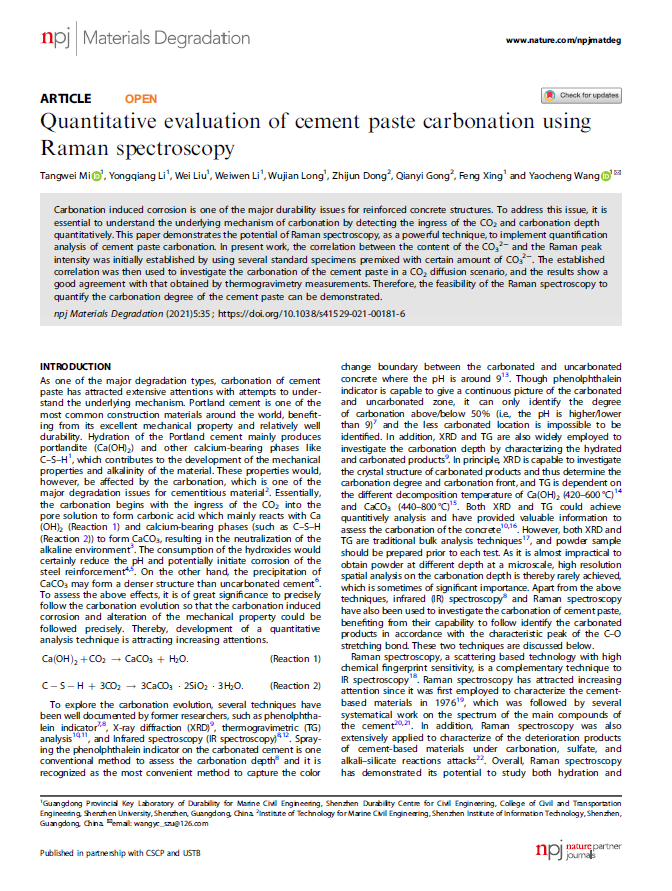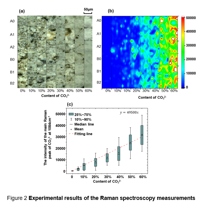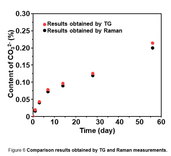 Carbonation induced corrosion is one of the major durability issues for reinforced concrete structures. To address this issue, it is essential to understand the underlying mechanism of carbonation by detecting the ingress of the CO2 and carbonation depth quantitatively. This paper demonstrates the potential of Raman spectroscopy, as a powerful technique, to implement quantification analysis of cement paste carbonation. In present work, the correlation between the content of the CO32- and the Raman peak intensity was initially established by using several standard specimens premixed with certain amount of CO32-. The established correlation was then used to investigate the carbonation of the cement paste in a CO2 diffusion scenario, and the results show a good agreement with that obtained by Thermogravimetry measurements. Therefore, the feasibility of the Raman spectroscopy to quantify the carbonation degree of the cement paste can be demonstrated.